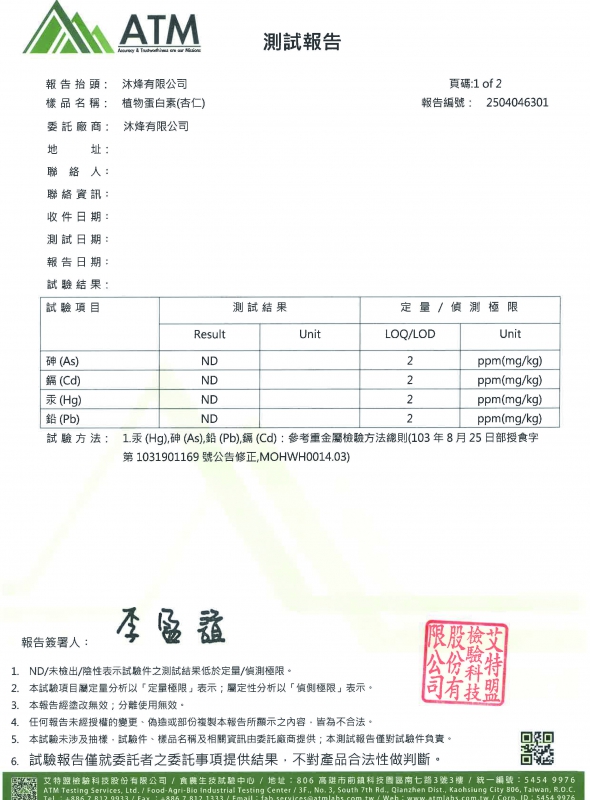 植物蛋白素(杏仁口味)-重金屬檢驗 2025