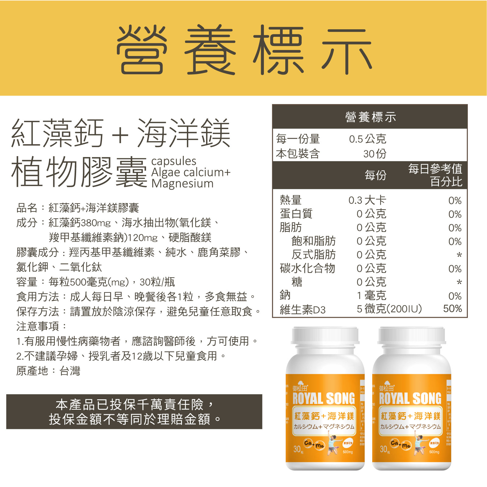 每粒含有紅藻鈣380mg,海洋鎂120mg