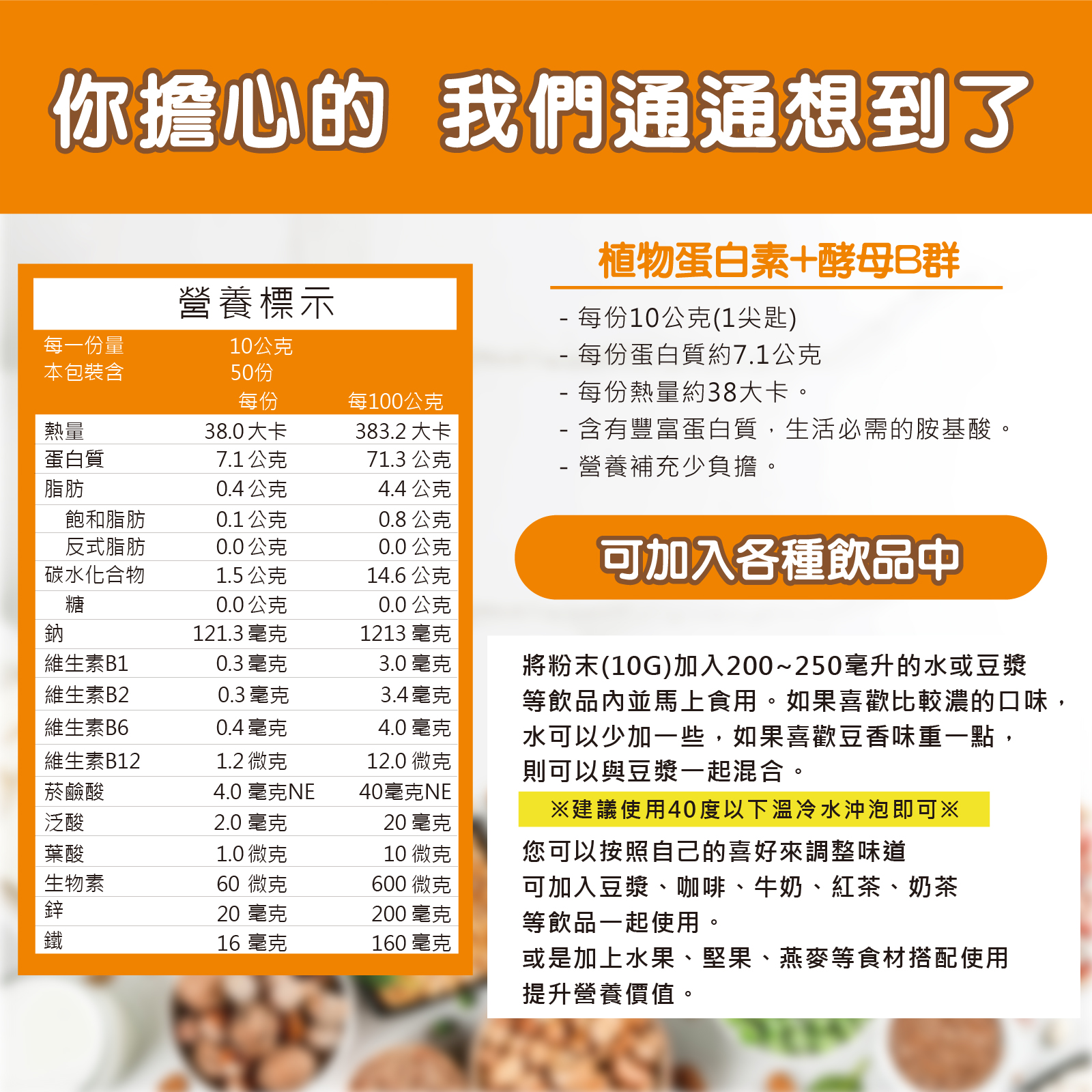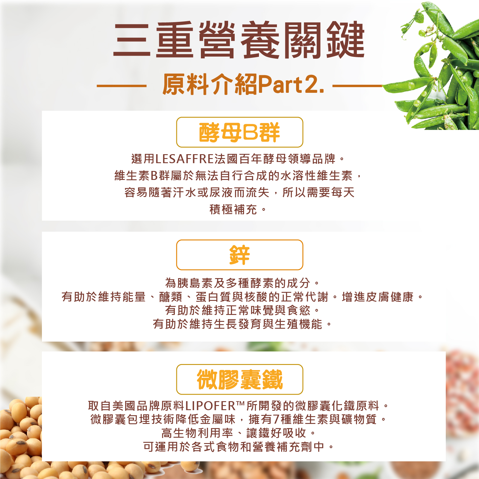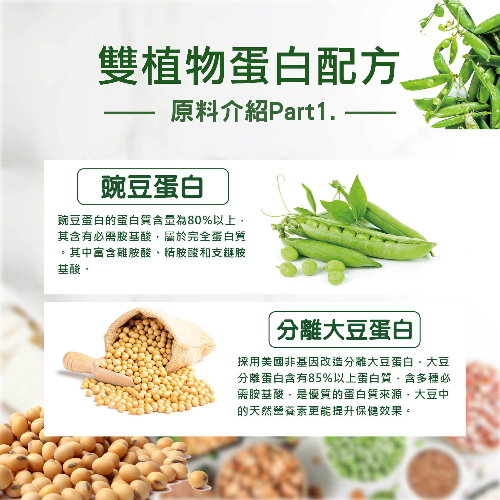 豌豆分離蛋白、大豆分離蛋白、燕麥粉、鋅酵母、微膠囊鐵