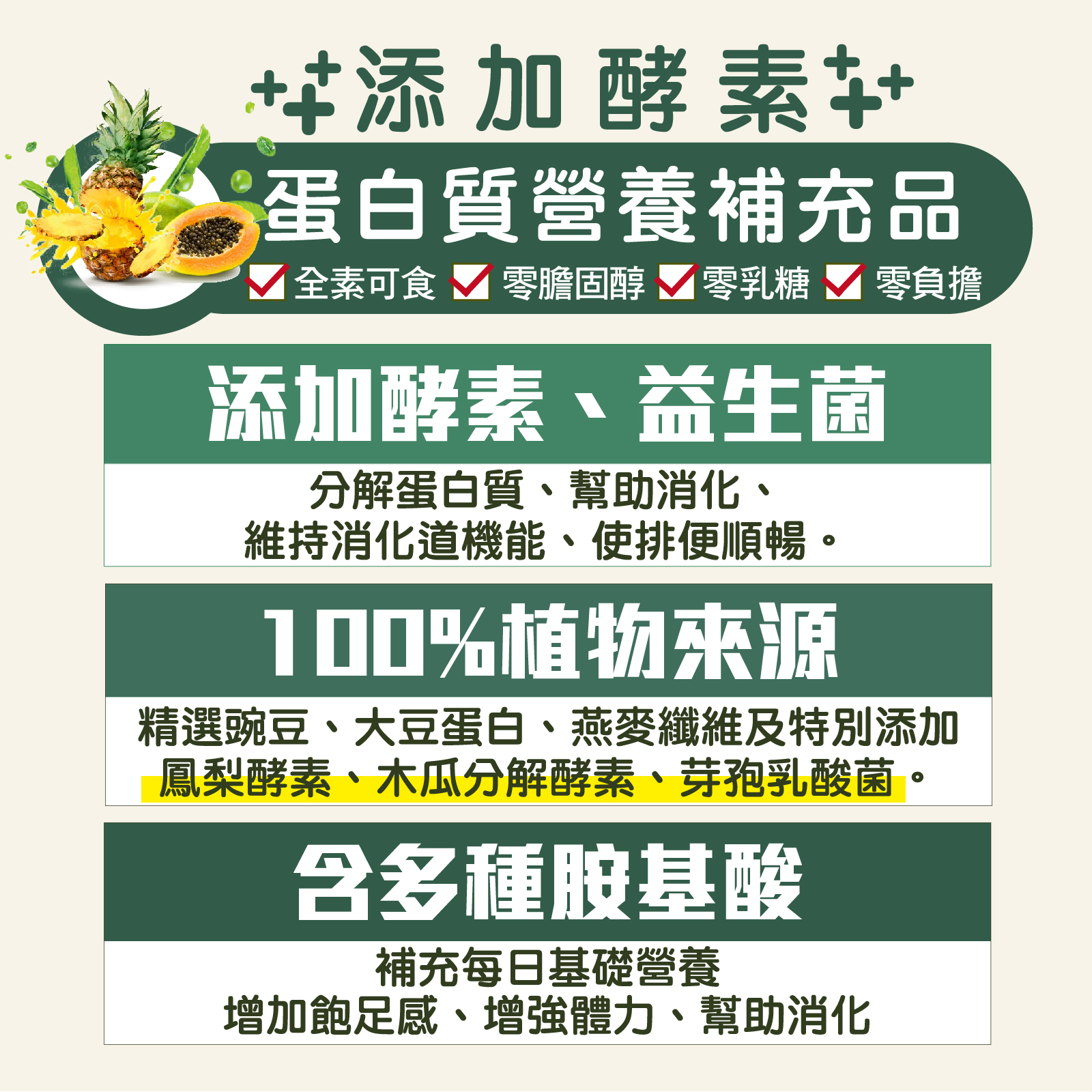 豌豆分離蛋白、大豆分離蛋白、燕麥粉、鳳梨酵素(麥芽糊精)、木瓜分解酵素(麥芽糊精、糊精)、大豆卵磷脂、芽孢乳酸菌(麥芽糊精)