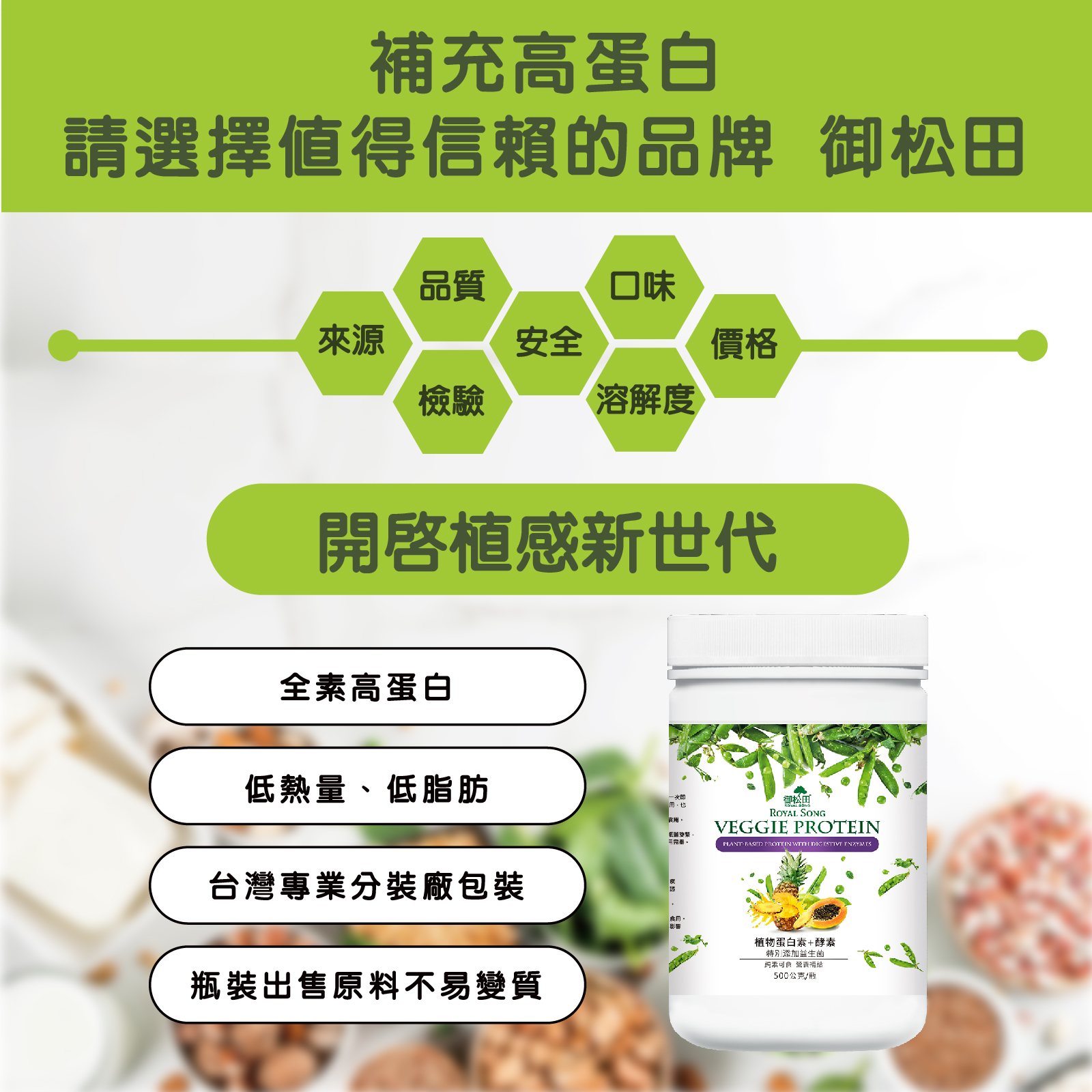 植物性蛋白質,100%全素,適合素食者食用