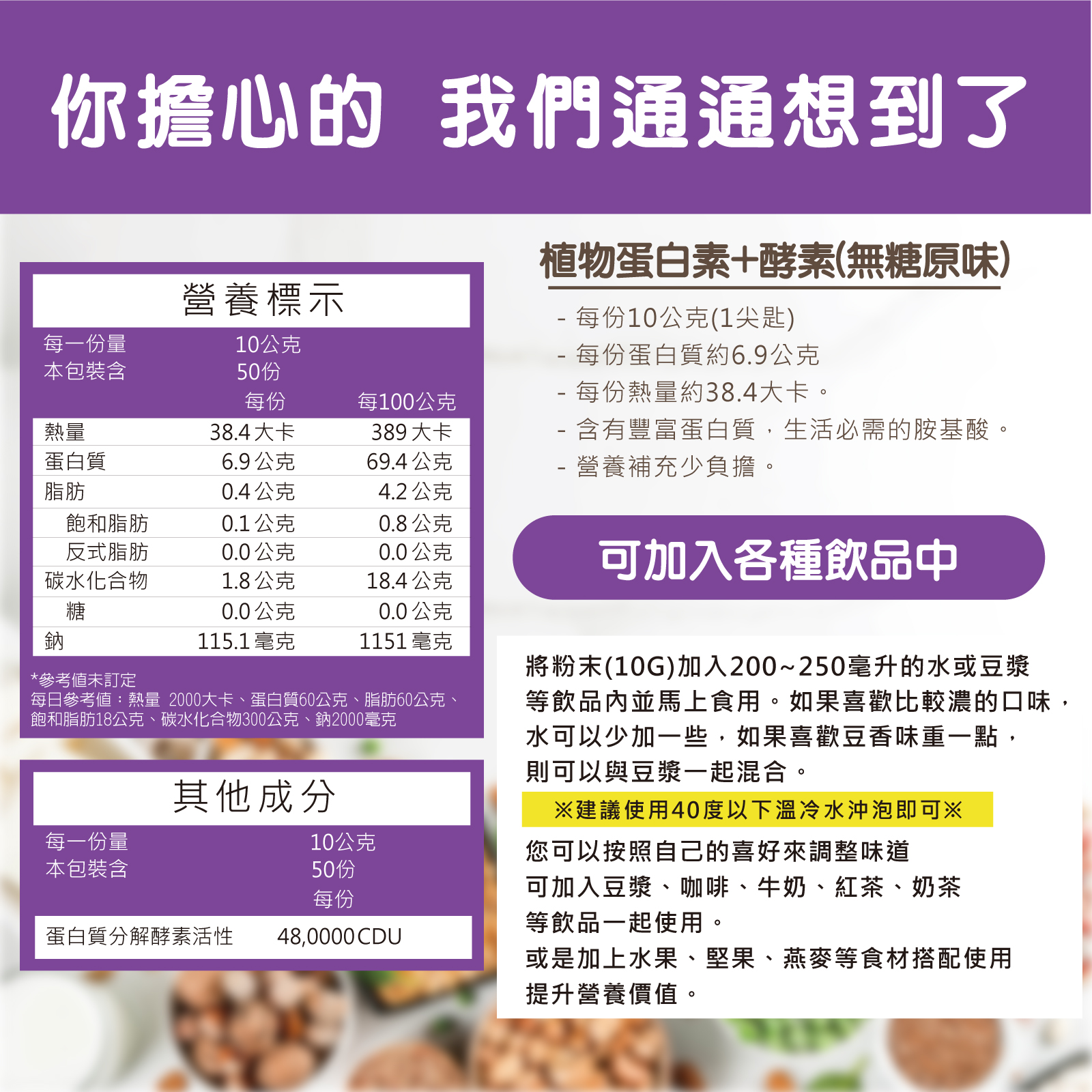 ※溫馨提醒:本產品含有大豆及含麩質之穀物,不適合其過敏體質者食用。