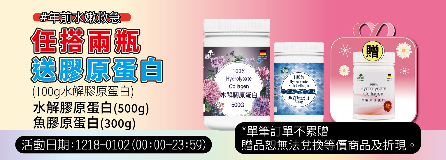 • 購買 活動賣場 內【水解膠原蛋白-家庭號】【魚膠原蛋白】商品,即贈送【水解膠原蛋白(100g/瓶)】x1