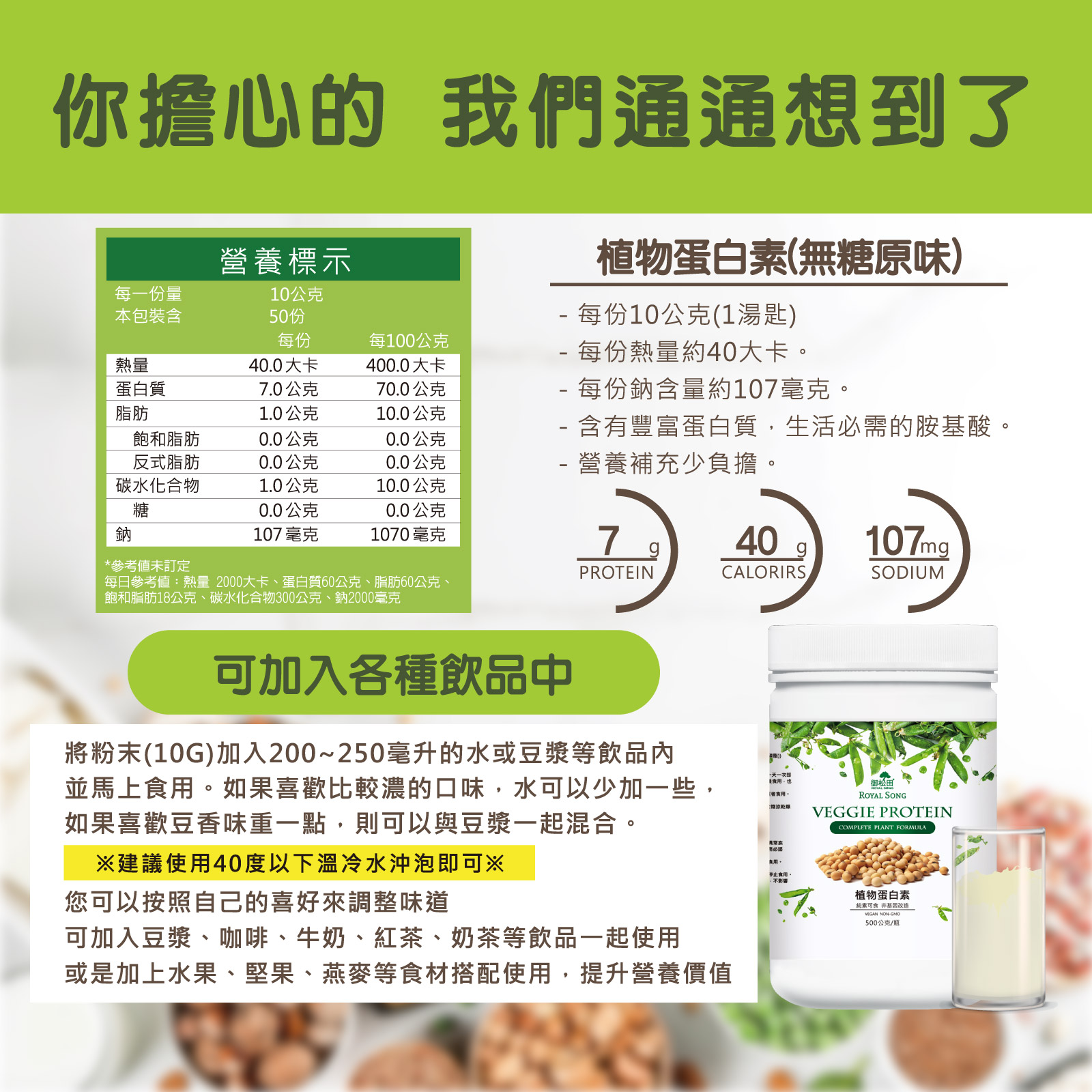 ※溫馨提醒:本產品含有大豆、堅果類及含麩質之穀物,不適合其過敏體質者食用。