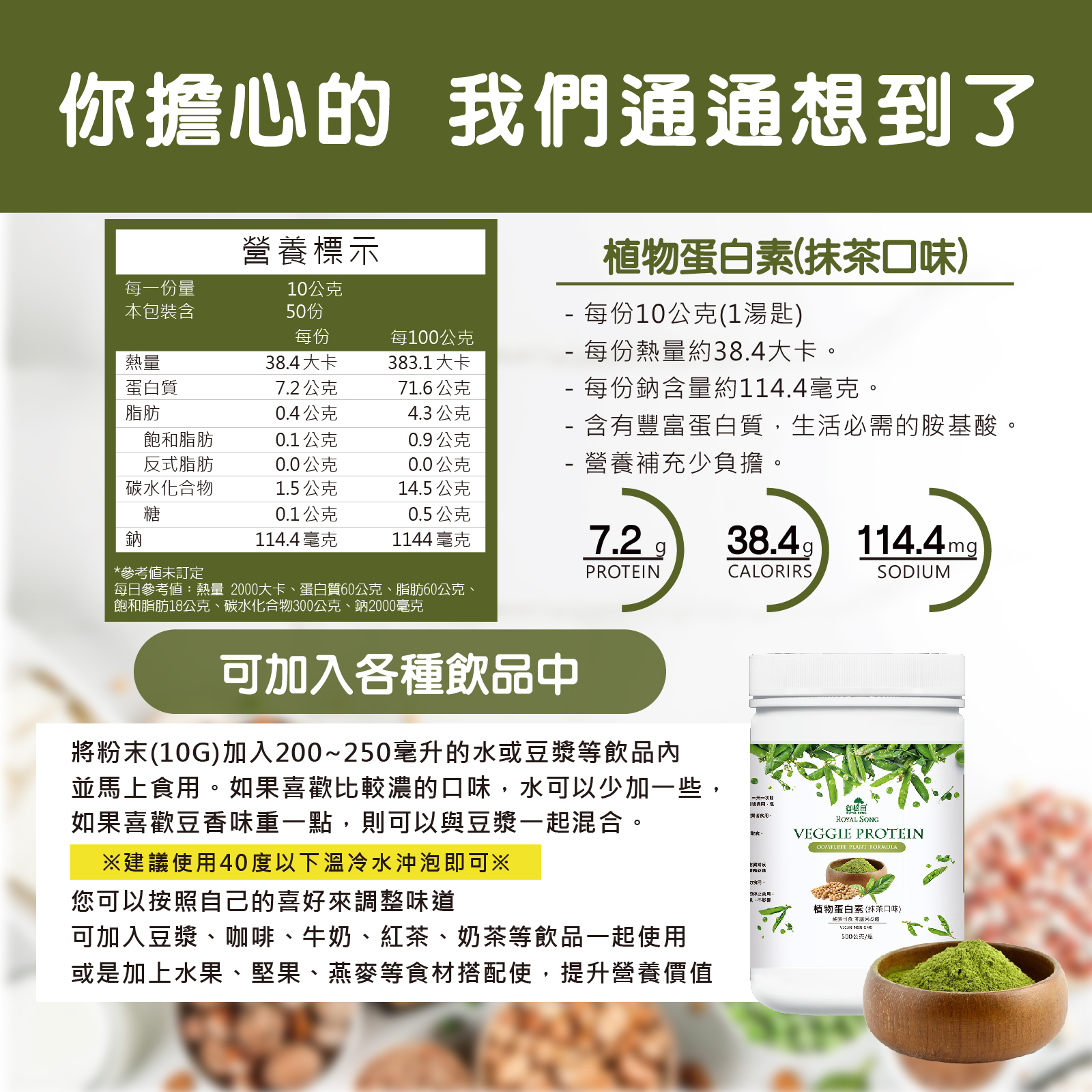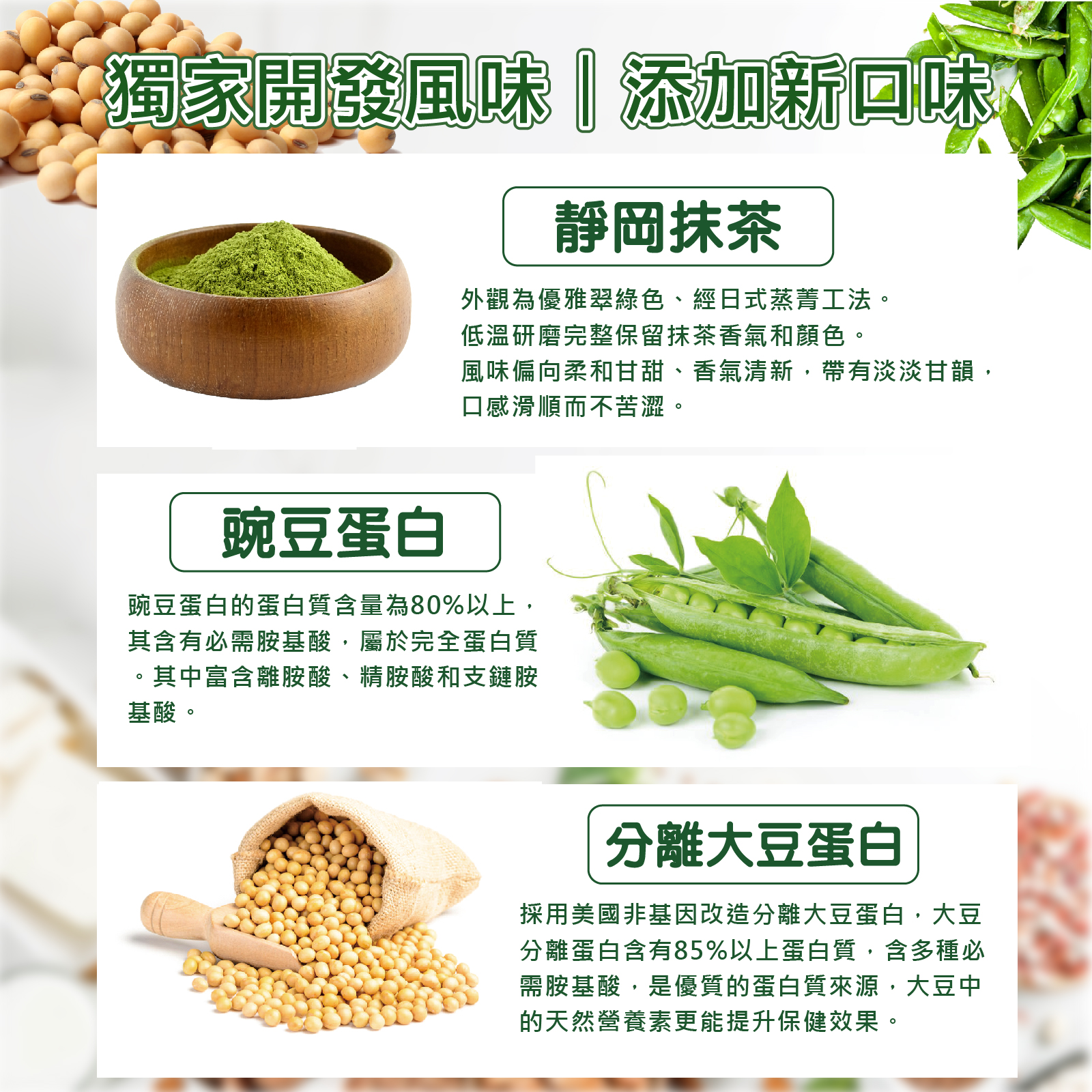 豌豆蛋白、分離大豆蛋白、燕麥粉、抹茶粉、卵磷脂、
